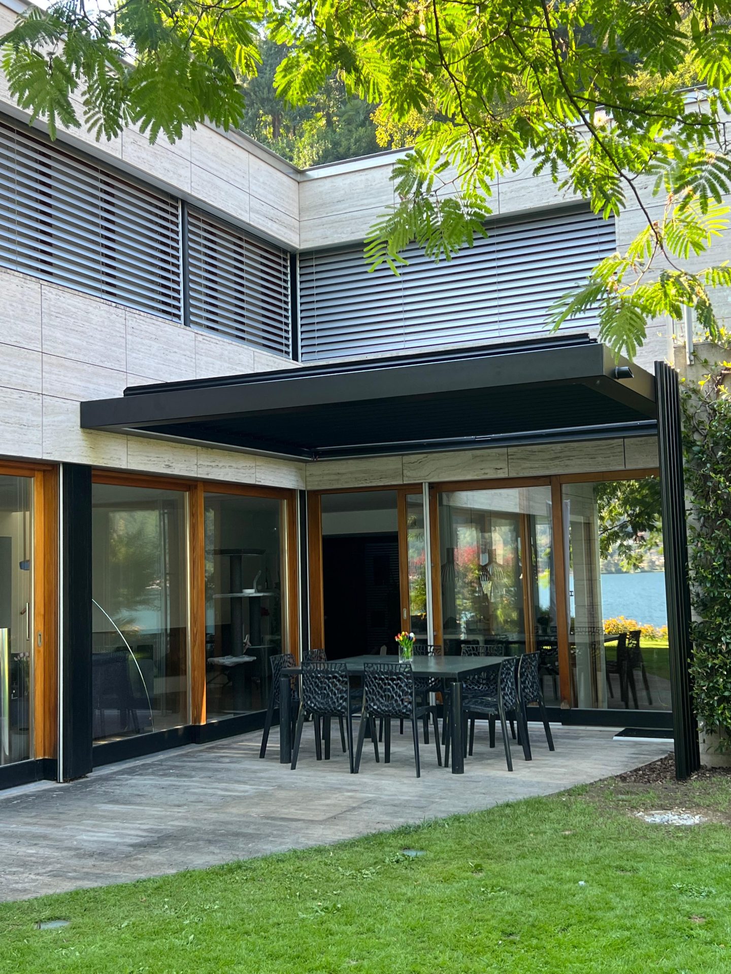 Le lame sono retrattili e orientabili: si compattano creando una finestra sul cielo. Pergola Bioclimatica con possibilità di chiusure laterali con tende o vetrate scorrevoli.